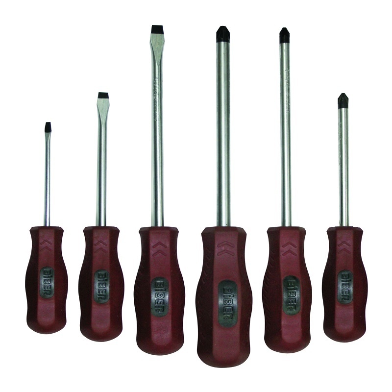 Описание и особенности: Отвертка имеет простейшую конструкцию: представляет собой металлический стержень, с одной стороны заточенный под определенный шлиц, а с другой расположена рукоятка для удобного удержания. Хром-ванадиевая сталь. Обрезиненная эргономичная ручка. Намагниченный наконечник. Набор из 6 отверток: плоский шлиц - 3х75, 5х100, 6х150; крестовой шлиц - #1х100, #2х150, #3х150.