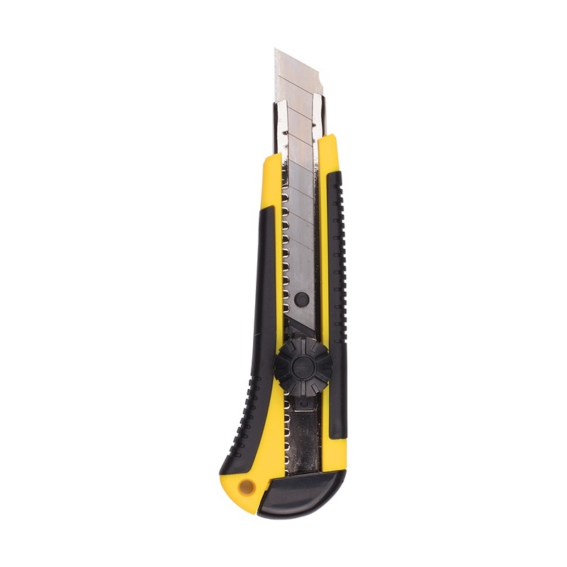 Описание и особенности: Корпус выполнен из пластика с прорезиненными вставками. Корпус усилен металлической направляющей. Оснащен отламывающимся сегментированным лезвием. Нож оснащен функцией автозагрузки лезвий, а также автоматического стопора лезвий и блокировки отсека хранения лезвий. Комплектуется 3-мя запасными лезвиями.
